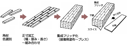 角材を製品サイズに集成接着したフリッチと呼ばれるものをスライスする方法が一般的です。