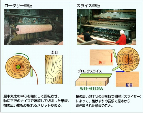- 丸太を大根のカツラムキのように薄く連続的に切削した単板のことを「ロータリー単板」、幅の広い包丁状の刃を持つ機械(スライサー)によって、鉋(かんな)削りのように原木から剥ぎ取られた単板のことを「スライス単板」と言います。