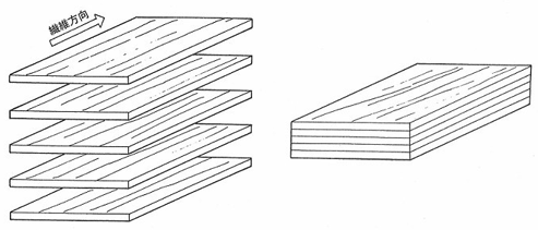 - 薄板を繊維方向に何枚も重ねて厚い板に成形したもの。曲げ強度に優れています。平行合板とも言います。