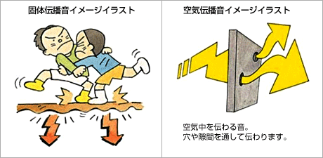 - 「固体伝搬音」は、たとえば子供が飛び跳ねて、階下や隣室に床や壁を伝わって聞こえる音です。「空気伝搬音」は、人の声やクラクションのように空気中を伝わって聞こえる音。穴や隙間を通して伝わります。