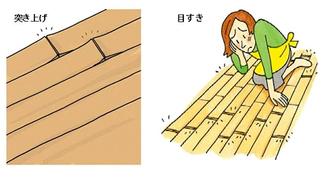 - 木は温度・湿度によって伸縮します。その伸縮にともない、反りや突き上げ(継ぎ目部分が盛り上がる現象)、目すき(継ぎ目部分に隙間ができる現象)が生じることがあります。