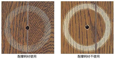 - フロアーは長年、人が歩きまわったり、物を引きずったりし続けると、表面塗装が摩耗し、着色がはげてくるなどの現象が起こります。最近では、多くのメーカーが床材表面塗装に耐摩耗材を配合しており、長い期間、表面の美しい床を保つことができます。