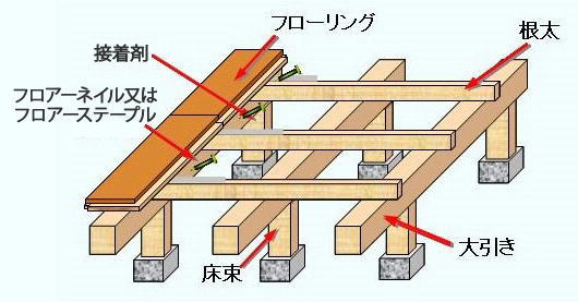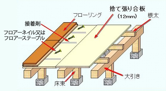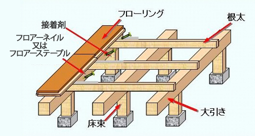 - 主として木造戸建住宅の床組みである根太上に、接着剤とフロアーネイル又はフロアーステープルなどを併用して床材を施工する方法のことです。
