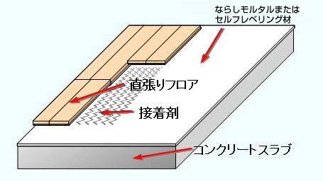 ⇒イラスト:コンクリートスラブに直張り床材を施工している図例です。