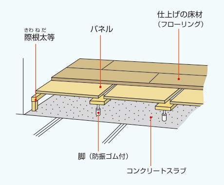 - 主にコンクリート床スラブの上にパーティクルボードなどのベースとなるパネルと、それを支持する支持脚によって床下を構成し、その上に床材を施工する方法です。支持脚は高さ調整が可能で、段差が解消できます。遮音効果を高めるタイプもあります。